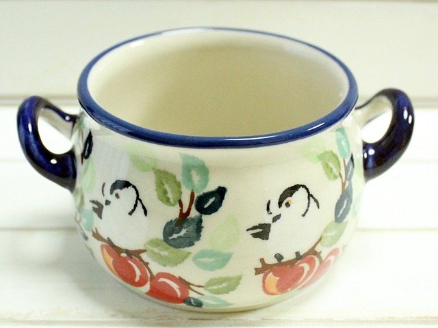 和風!家紋の絵付けのスープボウルです。 持ち手のついた、人気のフォルムのぽってりボウルは 容量たっぷりの370mlです。 ※ポーランド政府認定のシールと作家ネームとExclusive そして最高級品の証UNIKATが刻印されています。 製造元 : マヌファクトゥラ社 原産地 : ポーランド サイズ:高さ:6.5cm 持ち手を含む 長さ:14cm 容量:370ml