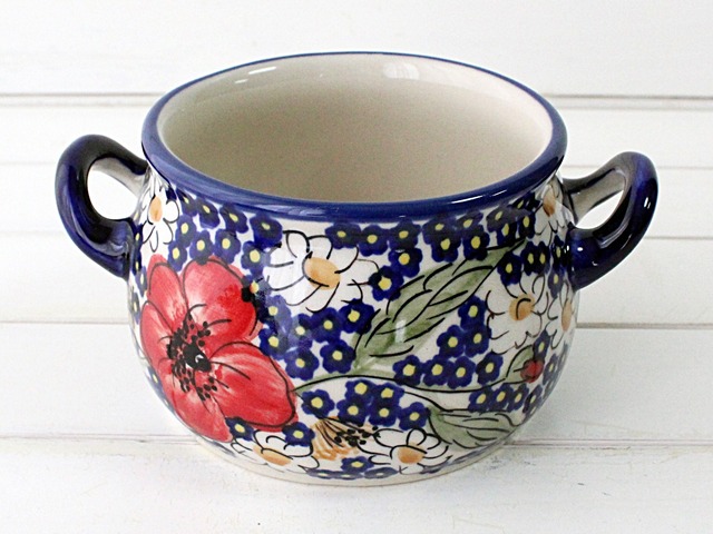 大きく真っ赤に手書きされた赤いお花に 白と小さな青いお花たち♪ 便利な持ち手(幅4㎝×2㎝)のついたスープボウル。 シチューにカレーボウルとして煮物椀や丼にも使えます。 容量たっぷりの370mlです。 製造元 : マヌファクトゥラ社 原産地 : ポーランド サイズ:口径9.5㎝×高さ6.5cm×持ち手を含む長さ14cm 容量:370ml