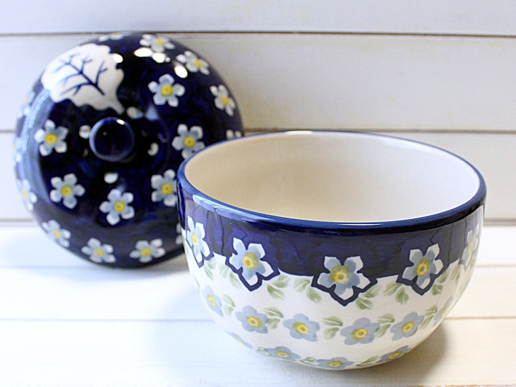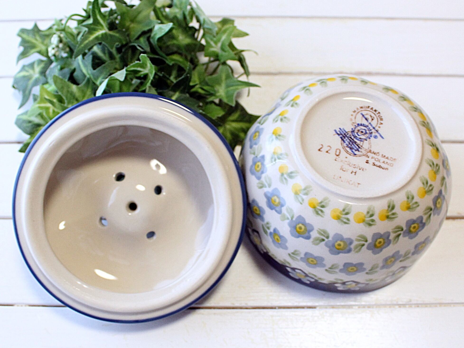 水色のお花と黄緑の葉っぱ♪優しい絵付けのリンゴポットです。