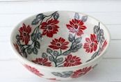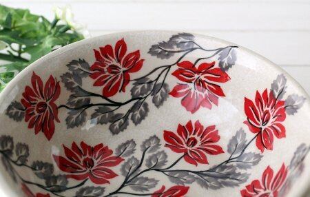 赤いお花とグレーの葉、背景に白の絵の具でレースの模様が絵付けされています!